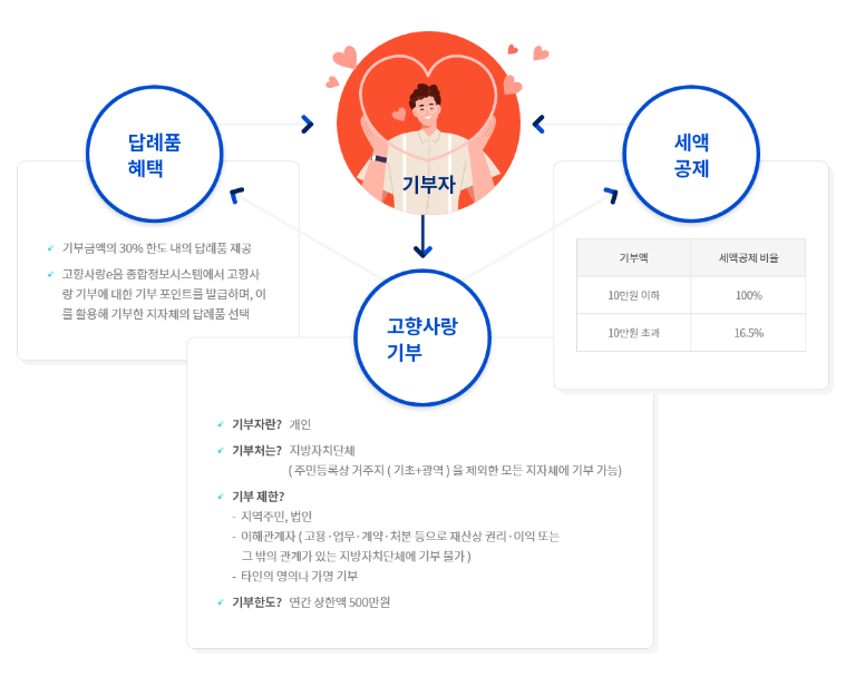기부자는 기부를 함으로써 지방자치단체 재정이 확충되고 지역주민 복리 증진(즉, 사회적 취약계층지원, 청소년 보호, 육성, 문화예술보건증진, 지역공동체활성화 지원, 기타 주민 복리 증진)이 될것이고 지역경제 활성화(관할구역 내 생산, 제조된 물품의 답례품 제공, 관할구역 내 통용되는 상품권 답례품제공, 지역경제 활성화 기여하는 지자체 자체 선정 답례품 제공(여행 상품 등)가 된다.
