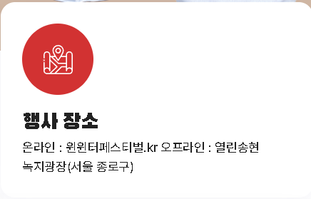 | 행사장소 | 온라인 : 윈윈터페스티벌.kr 오프라인 : 열린송현녹지광장(서울종로구) |